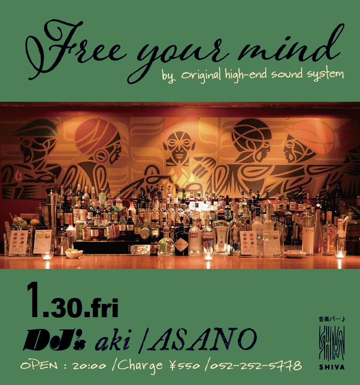 Free your mind 1月 30 Fri 2026 BAR SHIVA ♪ALL MIX INFORMATION DATE 2026.1.30 OPEN 20:00 VENUE BAR SHIVA CHARGE ¥550:乾き物FREE MUSIC SELECTOR DJ aki & ASANO PREV NEXT