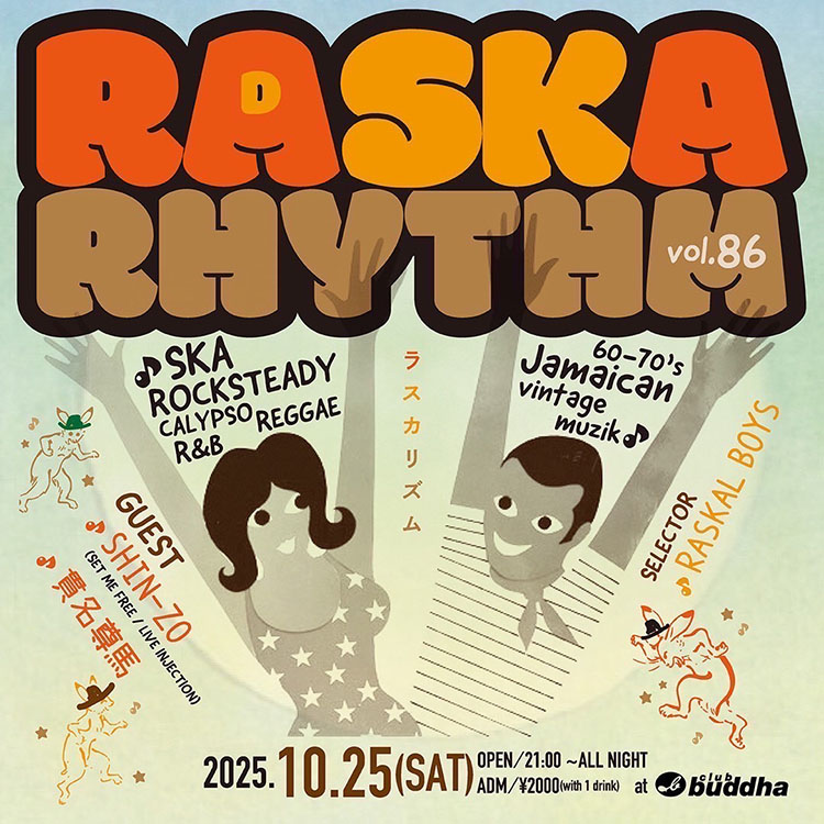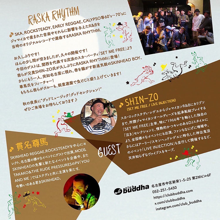お久しぶりです!ほんの少し間が空きましたが、久々の開催です!今回のゲストは、関西を代表する流浪のスカ・パーティ「SET ME FREE」より我らが兄貴SHIN-ZO氏が久しぶりにRASKA RHYTHMに登場!さらにもう一人、突如名古屋に現れ、巷を騒がす新進気鋭のSKINHEAD BOY、尊馬氏をフィーチャー!もちろん我らがクルーも、鋭意選盤で負けじと盛り上げていきます!秋の夜長に“グッドミュージック!グッドセレクション! ”是非ご来場をお待ちしております♪